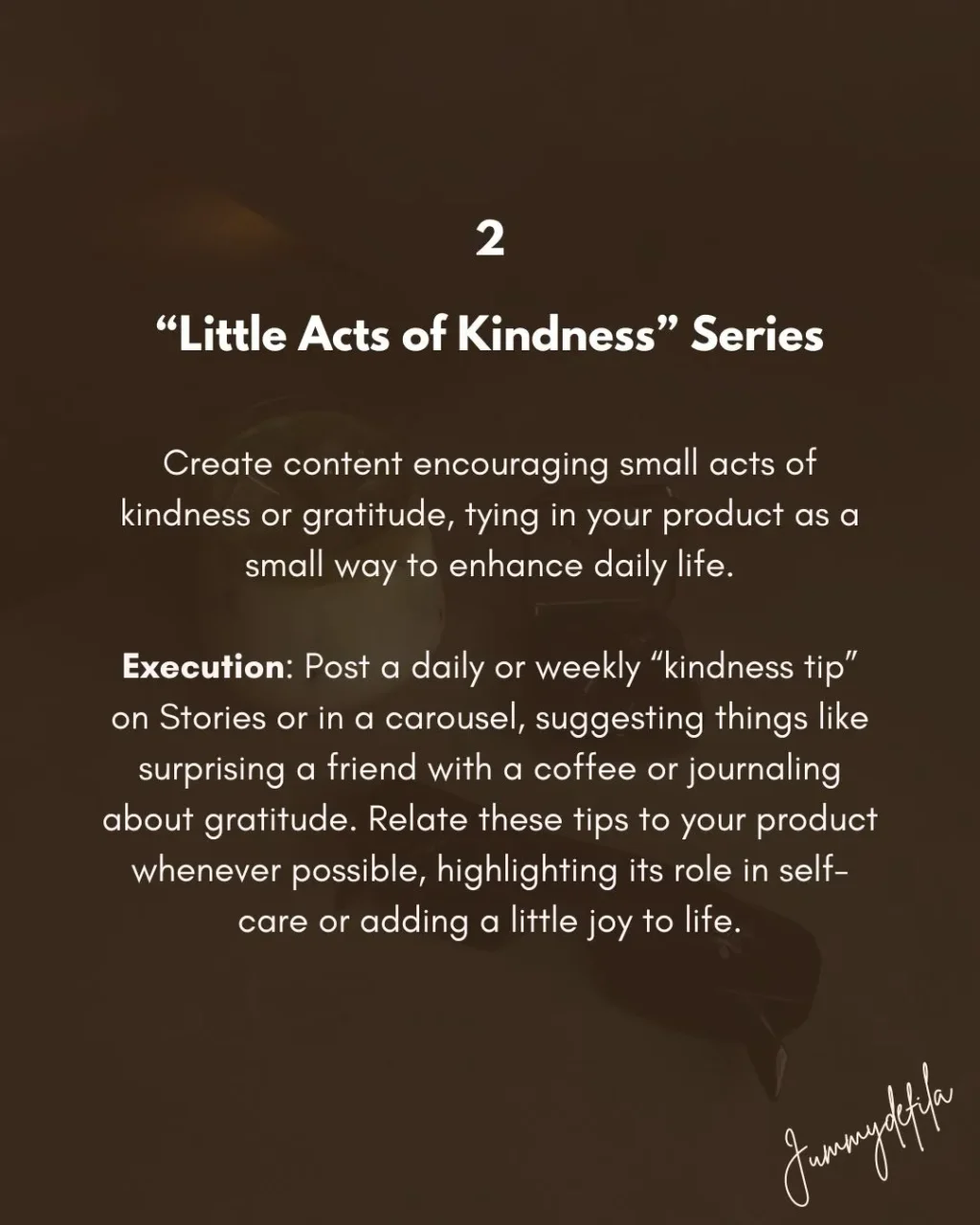 Execution: Post a daily or weekly “kindness tip” on Stories or in a carousel, suggesting things like surprising a friend with a coffee or journaling about gratitude. Relate these tips to your product whenever possible, highlighting its role in self-care or adding a little joy to life.