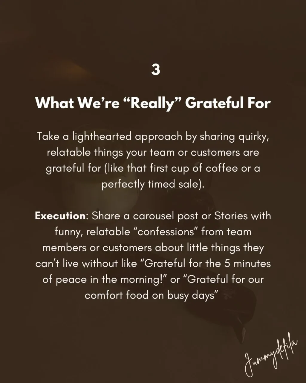 Execution: Share a carousel post or Stories with funny, relatable “confessions” from team members or customers about little things they can’t live without like “Grateful for the 5 minutes of peace in the morning!” or “Grateful for the quick fix meal on Chow deck.”