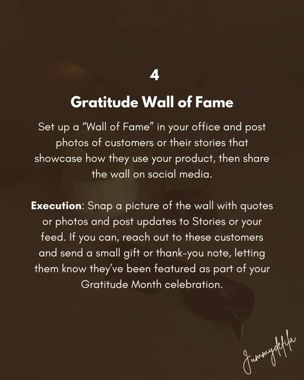 Execution: Snap a picture of the wall with quotes or photos and post updates to Stories or your feed. If you can, reach out to these customers and send a small gift or thank-you note, letting them know they’ve been featured as part of your Gratitude Month celebration.