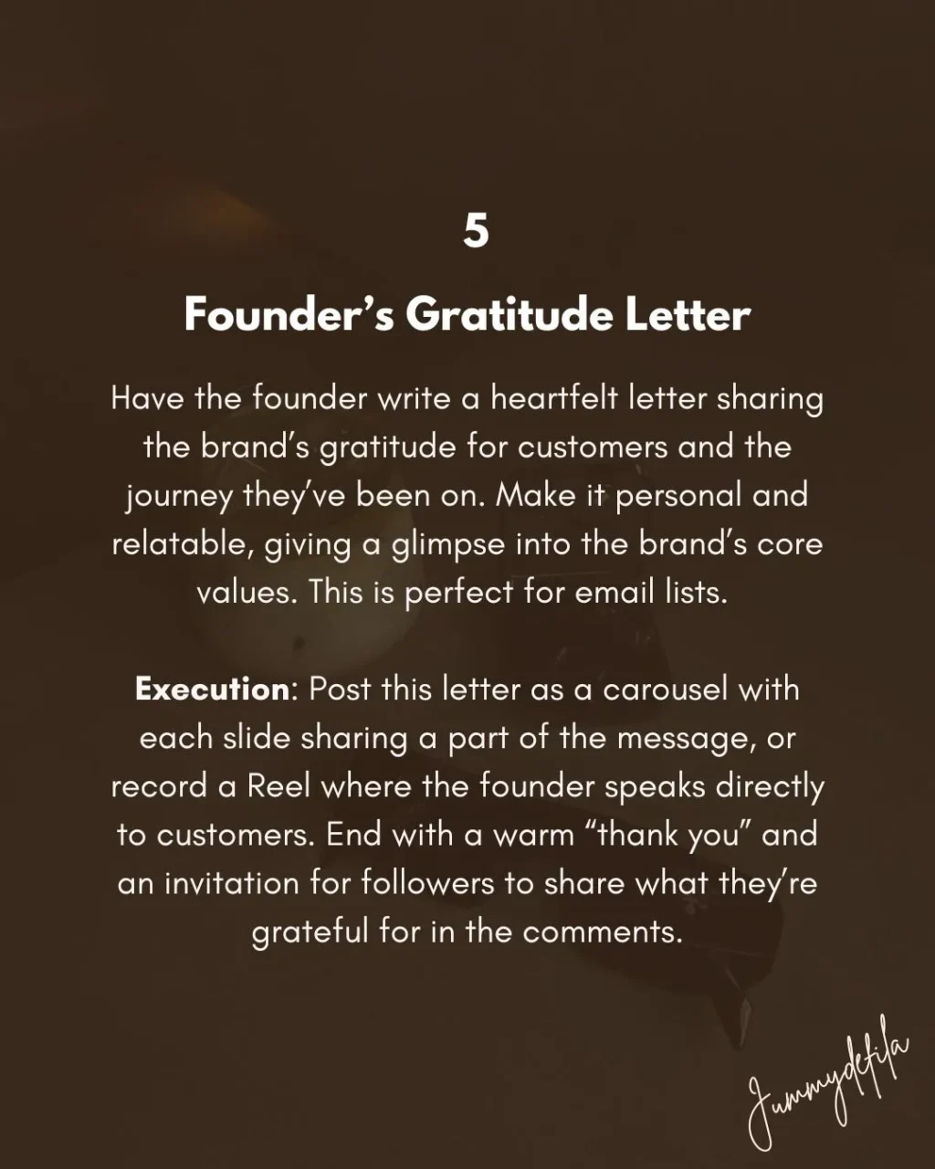 Execution: Post this letter as a carousel with each slide sharing a part of the message, or record a Reel where the founder speaks directly to customers. End with a warm “thank you” and an invitation for followers to share what they’re grateful for in the comments.