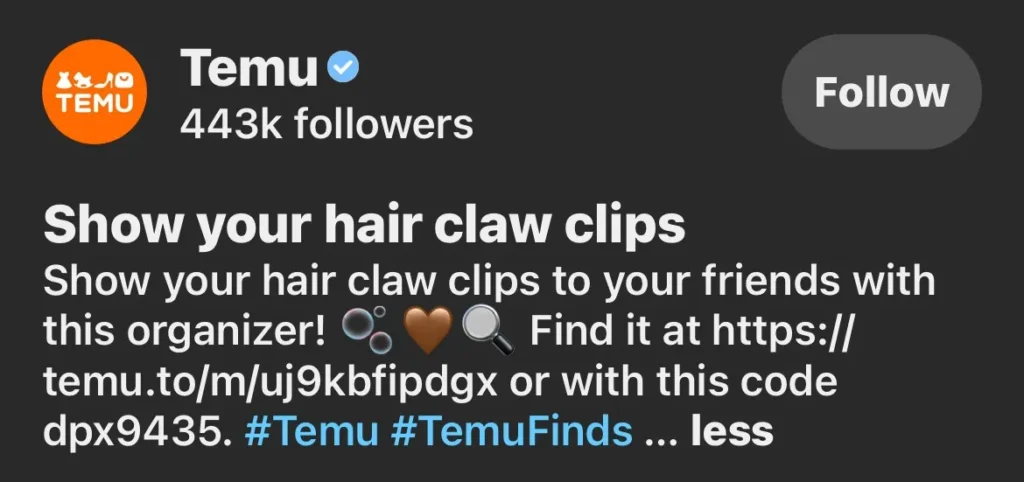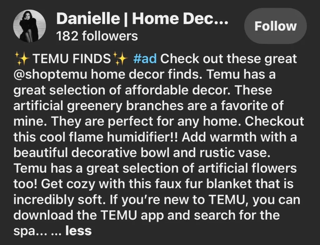 Let me tell you, Temu’s ads are clean, vibrant, visually appealing and engaging . As a content creator, If you want to catch their eye (or any brand’s eye), your content needs to match that energy. Invest in a good ring light, enhance your editing skills, and focus on producing content that brands will want to sponsor.